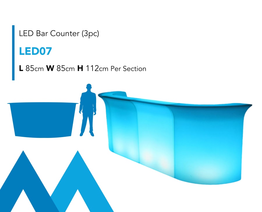 Description: Our LED Event Furniture Hire is hugely popular and makes a statement at any night time event. These colour changing LED Bar sections are a quick and effective event bar, wine bar, cocktail station or drinks reception solution.