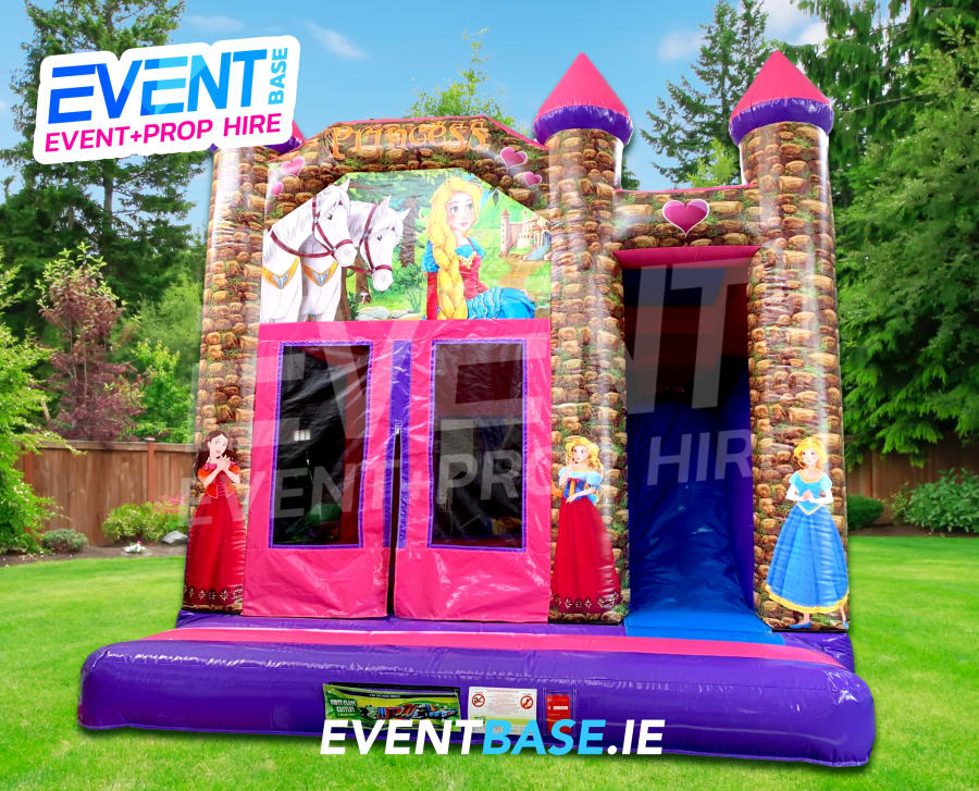 Description: 18ft(W) x 18ft(L) x 16.5ft(H) Pretty in Pink Princess themed Bouncy Castle with Slide Combo. It's a Bouncy Castle consisting of a climbing area and 2metre high internal slide. Fully enclosed bouncing area with safety netting allowing for increased visibility and ease of supervision with an open front. This unit has a generous bouncing area, as well as a climbing lane which leads to the all important slide. This inflatable is fully covered, including the slide area, which makes this inflatable a great all weather unit also. This unit has the highest safety rating and is highly recommended by our staff. The popular Princess stone Chateau design and complimentary colours are a hit with kids of all ages.