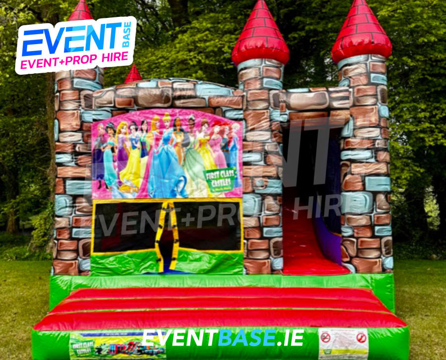 Description: 16ft(L) x 13ft(W) x 12ft(H) Bouncy Castle with slide. We've been hiring inflatables for 15 years and this model has been by far our most popular item since the very beginning, we refresh these bouncy castles annually, with a new range of themed banners in rotation. This particular product is a hugely popular Fairytale Princess theme. Visually stunning castle design, AT LAST!!! A bouncy castle that actually looks like a castle. The unit consists of a generous bouncing area with a climbing lane which leads to a 6ft high internal slide, which exits the castle. Great fun, oh to top it all off. . . . a basketball net is fitted to the side of the castle also. Easy unit to supervise with safe visibility netting all around and ideal for gardens when a slide is required but width may be an issue. This castle is designed to keep the slide and castle covered in the event of bad weather.