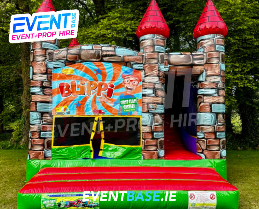 Description: 16ft(L) x 13ft(W) x 12ft(H) Bouncy Castle with slide. We've been hiring inflatables for 15 years and this model has been by far our most popular item since the very beginning, we refresh these bouncy castles annually, with a new range of themed banners in rotation. This particular product is a hugely popular Blippi theme. Visually stunning castle design, AT LAST!!! A bouncy castle that actually looks like a castle. The unit consists of a generous bouncing area with a climbing lane which leads to a 6ft high internal slide, which exits the castle. Great fun, oh to top it all off. . . . a basketball net is fitted to the side of the castle also. Easy unit to supervise with safe visibility netting all around and ideal for gardens when a slide is required but width may be an issue. This castle is designed to keep the slide and castle covered in the event of bad weather.