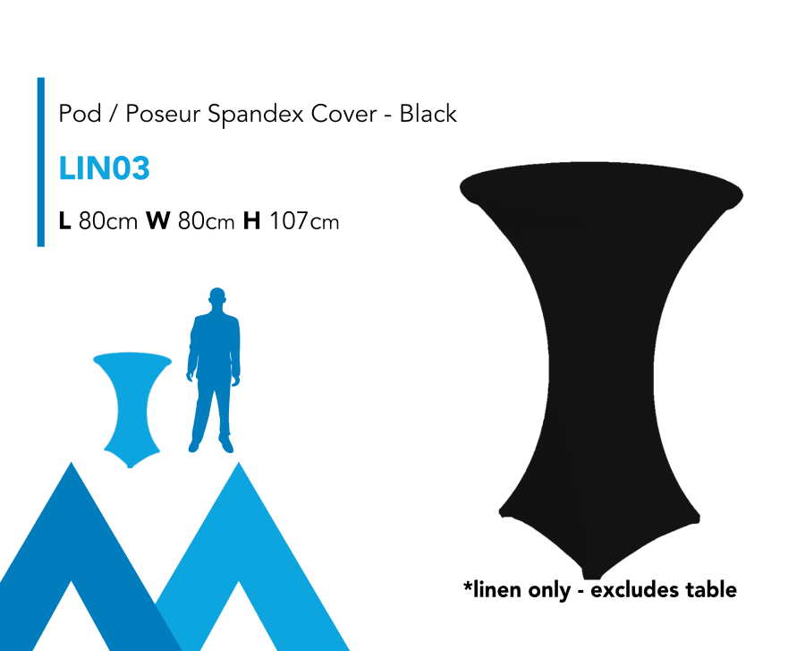 Description: Pod / Poseur Spandex Linen Cove Hire, compatible with our Pod Tables and available in an assortment of colours.
