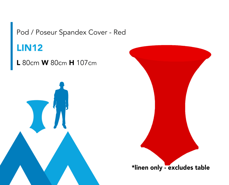 Description: Pod / Poseur Spandex Linen Cove Hire, compatible with our Pod Tables and available in an assortment of colours.