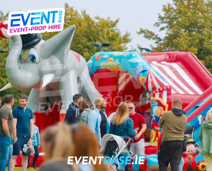 Bounce and slide out beneath the Elephant's head. Ideal for narrow gardens with limited space and indoor venues. Awesome 3D Elephant Head leaping out of the front of the unit which is visually striking and the perfect theme setter for any Circus, Carnival or Fairground themed party or event. This unit is fully covered and is essentially an inflatable room. Looks fantastic with digitally printed Circus artwork throughout, even has a striped big top effect red & white roof!.