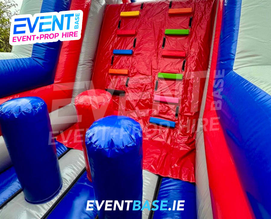 Description: Measuring 60ft(L) x 12ft(W) x 16ft(H) "Adrenaline Rush" is a mega twin lane Obstacle Course with integrated 10ft platform drop slide. This Obstacle Course for hire is HUGE! Suitable for any age group, both Adults & Kids events alike (just not at the same time of course!) Consists of climbing, crawling and sliding areas. Really impressive and large scale unit for any event. This is a monster. This product is also available in an other colour combinations, be sure to explore our full 'Obstacle Courses' selection to pick the perfect one, we have the largest selection in Ireland! This item is exclusively designed and built for First Class Castles. Click on the 'more info' button to view additional images. This assault course inflatable is fantastic as part of a team building activity, it's a Knockout or Olympic Challenge Course. Contact our team for further information on Family Fun Day events and Corporate Entertainment + Team Building Activities.
