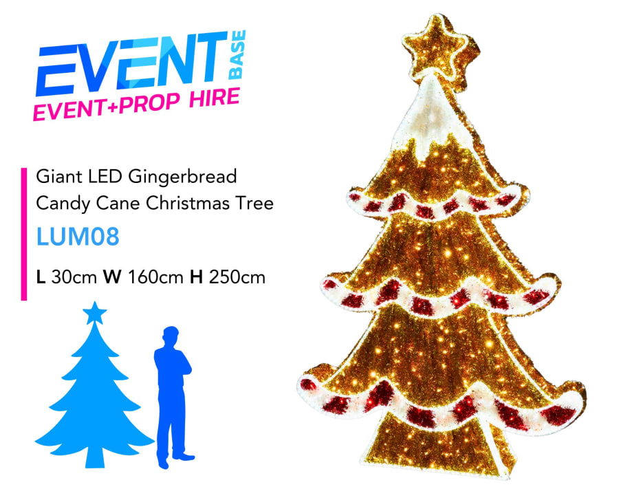 Description: Introducing exceptional LED Giant LED Gingerbread Candy Cane Christmas Tree (LUM08) for Hire. This illuminating free-standing prop is the perfect photo opportunity for any Seasonal Event. Requires access to a power supply for the integrated LED lighting and can be installed indoors or outdoors. A covered space is preferred in an outdoor setting to keep guests dry. This item can also be branding to incorporate any client logo or event theming on the frame itself. Contact us directly regarding your branding requirements. 📸
