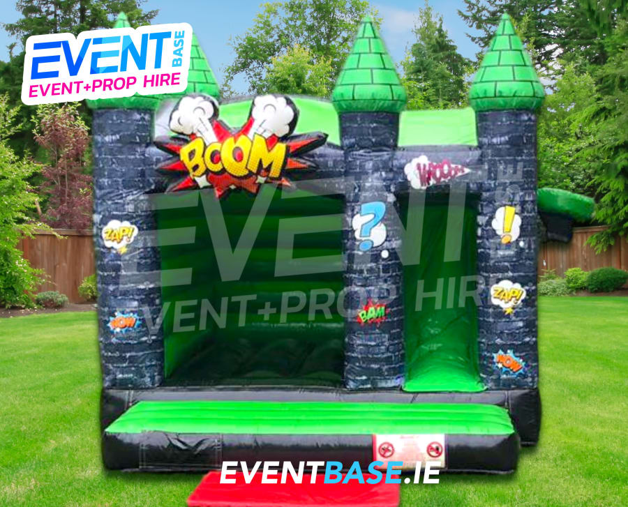 Description: Boom Comic themed Bouncy Castle consisting of a climbing area and 5ft Internal Slide. Fully enclosed bouncing area with safety netting allowing for increased visibility and ease of supervision with an open front. This unit has a generous bouncing area, as well as a climbing lane which leads to the all important slide. This inflatable is fully covered, including the slide area, which makes this inflatable a great all weather unit also. This unit has the highest safety rating and is highly recommended by our staff. Kids love the classic comic action artwork, perfect for a super hero. Check out our matching Comic themed Obstacle Course also available to hire.