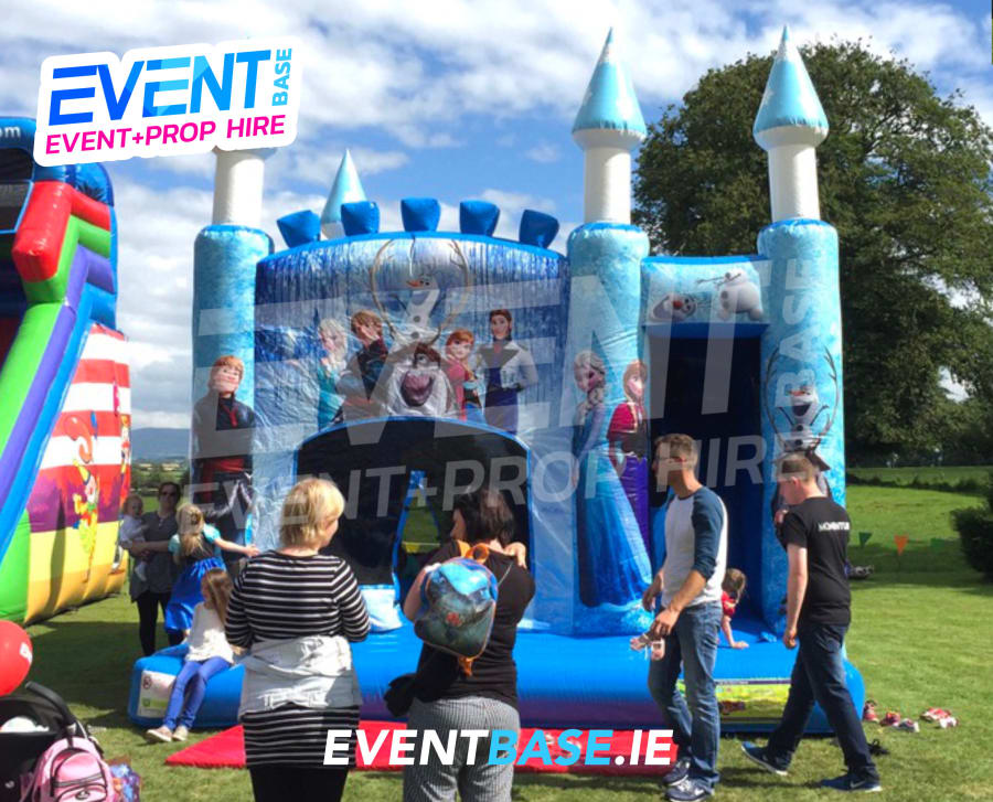 Description: 18ft(L) x 18ft(W) x 20ft(H) Frozen themed Bounce & Slide. Enter the magical Frozen fairytale fortress and let your little ice queen's imagination run wild! Illustrated with your favourite Frozen characters, the bouncy castle consists of a climbing area and 2metre high internal slide. Fully enclosed bouncing area with safety netting allowing for increased visibility and ease of supervision with an open front. This unit has a generous bouncing area with pop-up tubes, as well as a climbing lane which leads to the all important slide. This inflatable is fully covered, including the slide area, which makes this inflatable a great all weather unit also. This unit has the highest safety rating and is highly recommended by our staff. Kids love the hugely popular Frozen artwork.