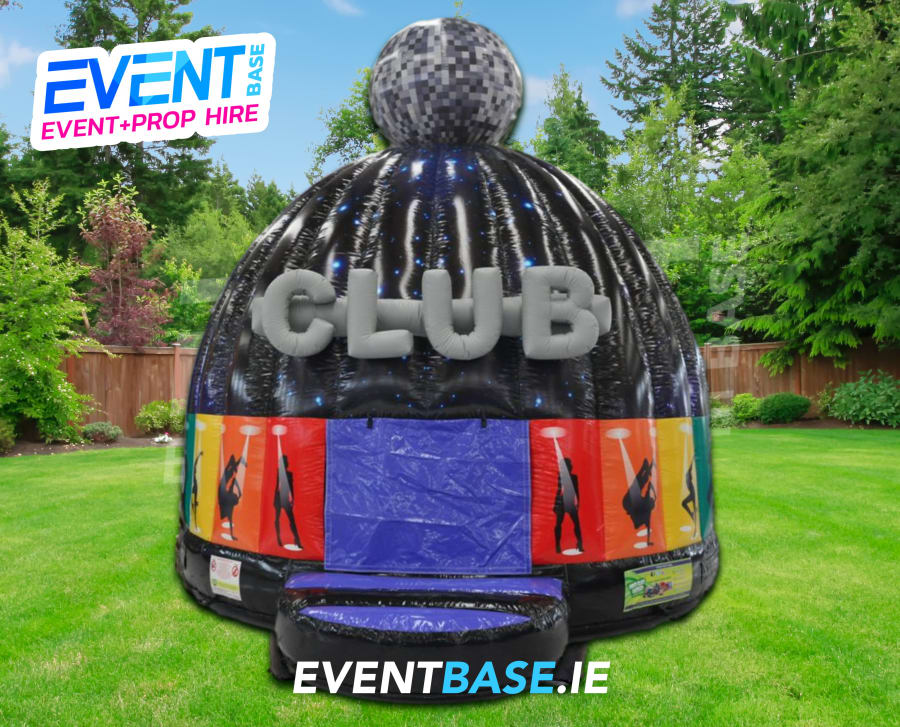 Description: Mega Multi-coloured Inflatable Dome with Bouncy Floor.... Why Hire a DJ when you can hire this? Neutral club theme with 3D Club sign over the entrance. This dome is easy to access for all ages as there are no squeeze doors like other domes. The dome is fitted with a Bluetooth enabled music system, meaning your guests can connect their phones to send music to the Bouncy Castle! How Cool! The dome is also fitted with a flashing lighting system, which is reflected off the gloss black interior, bouncing the light all around the dark chamber. The exterior is printed in an incredible disco theme and the high star lit roof is a sight which will be seen all around with a huge visual impact. The dome is also fully weather-proof, ideal all year around. Protect Yourself from the Irish weather hire one of these. Highly Recommended. Oh, and this is the only product of it's type with design rights exclusive to EventBase... it will not be found elsewhere!