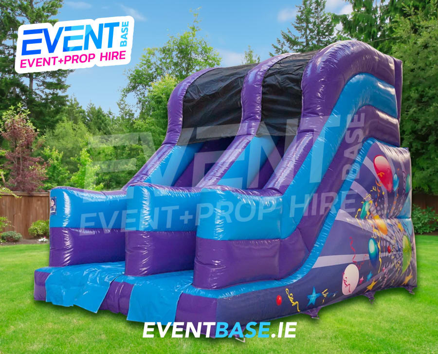 Description: Perfect Party Bouncy Slide. Great 8ft high Platform Slide. Kids get hours of enjoyment out of these slides and at a reasonable price. Safe, gently sloping slide perfect for younger kids and when space is limited. Nice neutral multi-colour theme and party theme print, appealing to girls and boys of all ages.