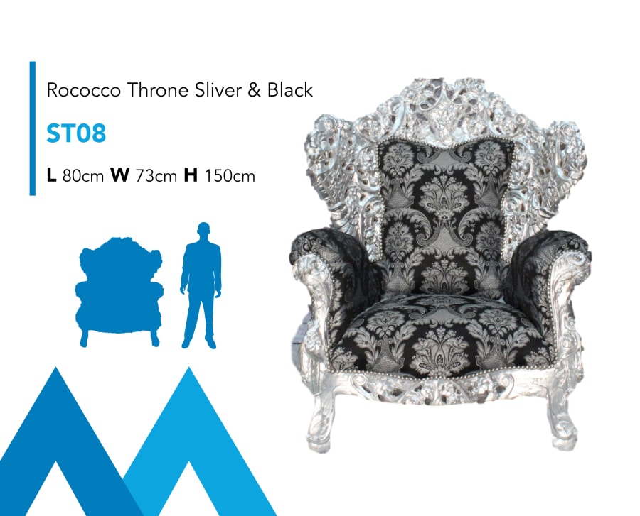 Description: This Rococo is fantastically tacky... perfect when you need a real statement. This chair has a silver frame with black and silver upholstery. Exclusively available in Ireland through EventBase. This unit is a fantastic photo opportunity and perfect for any Santa's Grotto. We have a huge range of Christmas event props available for hire. Including life-size reindeers, snowmen, santa's throne, sleighs & lots more... Contact us for further information. Long and short-term hire available. Check out our other items which may be added to this item in order to create a unique Santa's Grotto. Full Event Hire & Grotto Packages available including; Grotto, Lighting, Santa's Throne, Props, Carpet, Christmas Trees, Decorations etc... Grotto Management including Staff & Gifts also available.