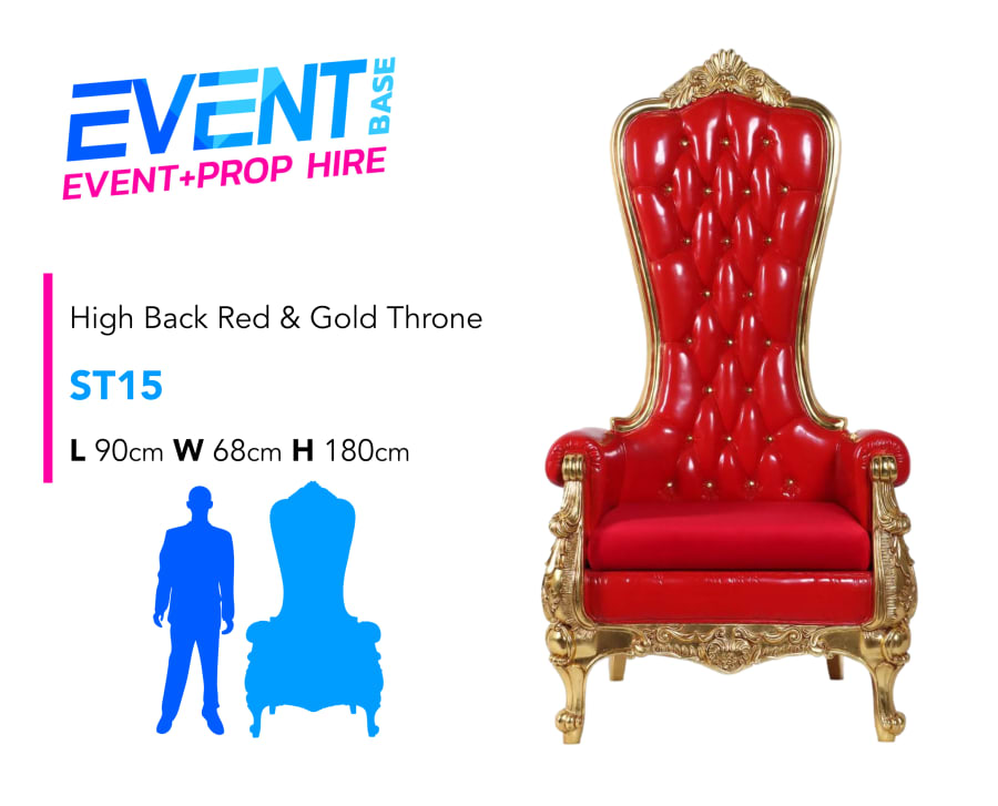 With its tall backrest, rich red upholstery and ornate gold frame, this high back throne hire is not only visually impressive but also a fantastic photo opportunity for guests. Perfect for creating magical Christmas moments with Santa or adding theatrical flair to corporate events and themed parties.