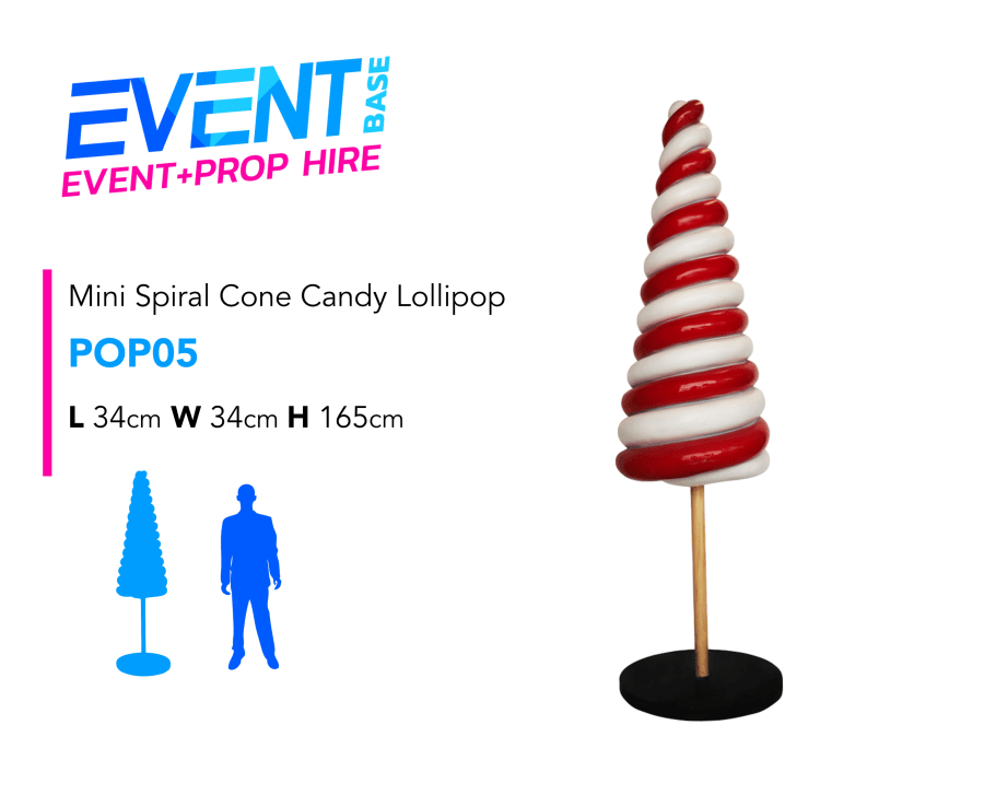 Description: Introducing our Mini Spiral Cone Pop. This is a hugely popular lollipop / candy prop hire item. Standing almost 5ft high, this lollipop on stand with base is a really striking item. This prop display model is ideal for any Christmas, Santa's Grotto, Candy Land, Charlie & the Chocolate Factory, Willy Wonka, Carnival or Giant Sweet theme!