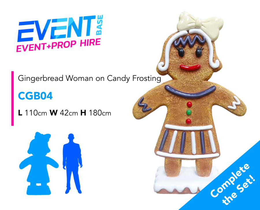 Description: This Gingerbread Woman prop for hire is a cute model and one part of a family set. Check out the other members of this Gingerbread Family including; cats, dogs, drums, sleighs and even thrones! This prop display model is ideal for any Christmas, Santa's Grotto, Candy Land, Charlie & the Chocolate Factory, Willy Wonka, Carnival, Grinch or Giant Sweet theme!