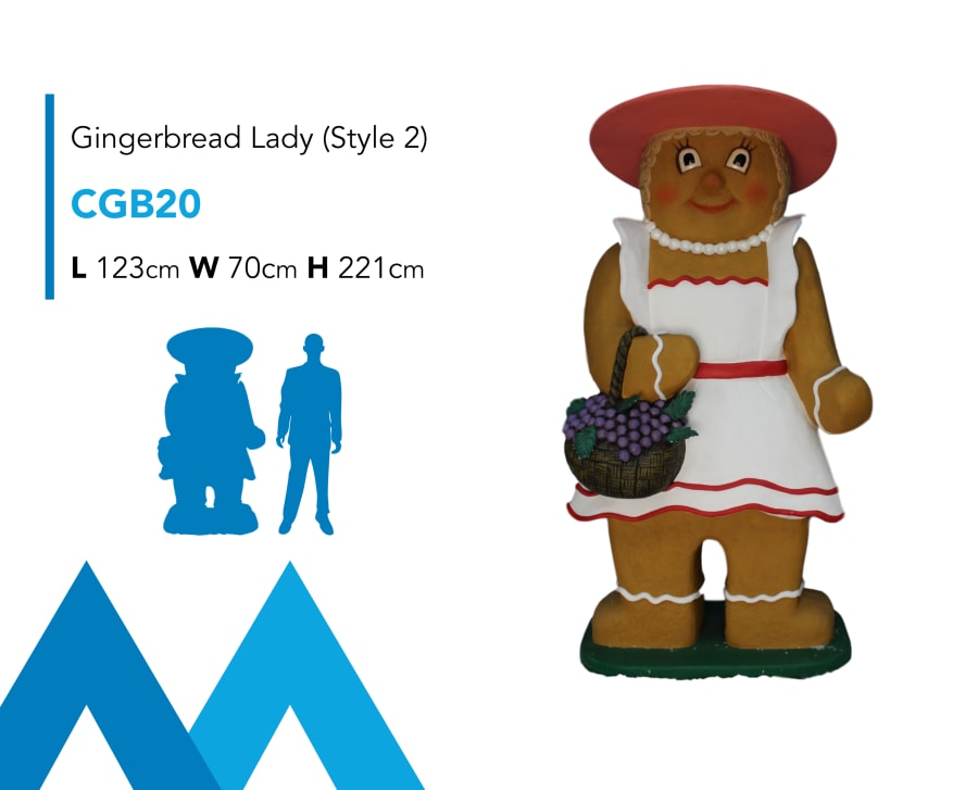 Description: Here we a nice Gingerbread Lady prop model holding a basket of fruit, as part of our second Gingerbread Family type. This is a nice piece and looks great at a variety of events. This prop display model is ideal for any Christmas, Santa's Grotto, Candy Land, Charlie & the Chocolate Factory, Willy Wonka, Carnival, Grinch or Giant Sweet theme!