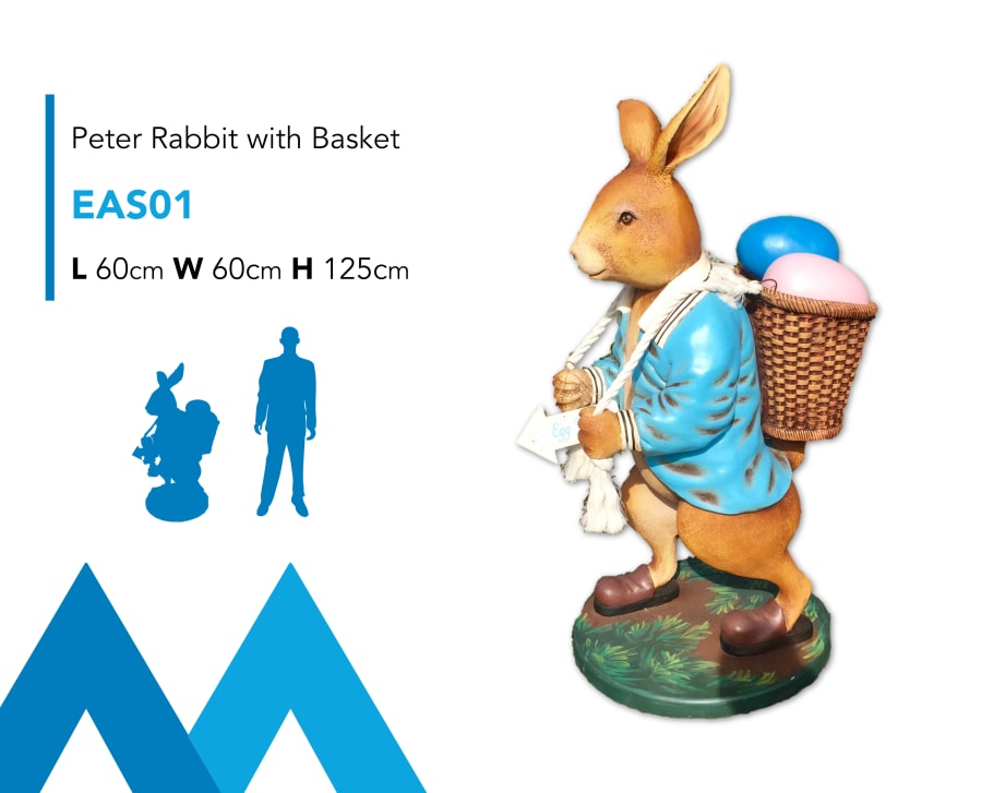 Description: Introducing this cute little Peter Rabbit Easter Bunny inspired prop, complete with wicker style basket to hold Easter Eggs. This prop model for hire is perfect for any Easter Egg Hunt or Easter themed event, Wildlife Theme or Garden Theme. We have the widest selection of Easter & Seasonal Theme props in Ireland.