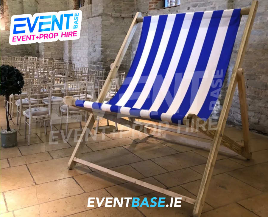 Description: First Class Castles are delighted to introduce our Giant Deck Chairs. These chairs create a fun and interactive photo opportunity experience at any party, festival, fun day, corporate event or wedding. This chair has a blue and white striped patter. Check out our other Red& White Chair also available to hire. We recommend that the weight load on the Giant Deckchair doesn't exceed 250kg.