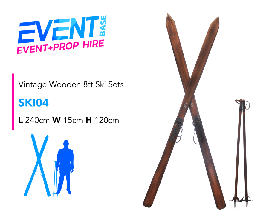 Description: Bring the 'Pistes' to your Party! Our incredible 8ft Long Wooden Ski Props are an exceptional decorative piece to set the scene. Transport your guests on an Après Ski Party on the Ski Slopes. These stunning vintage ski prop sets can be used simply as decorative items or as to enhance photo scenes & festive displays at your Christmas Wonderland or Après Ski Themed Event! Complete the look by browsing our complete range of props available to hire including; Snow Trees, Festoon Lighting, Apres Ski Signage, Vintage Suitcases, Vintage Ski Sets, Reindeer Rugs & Furs, Uplighting, Snow Themed Backdrops & more… Recreate a stunning Alpine setting combining a selection of our props.