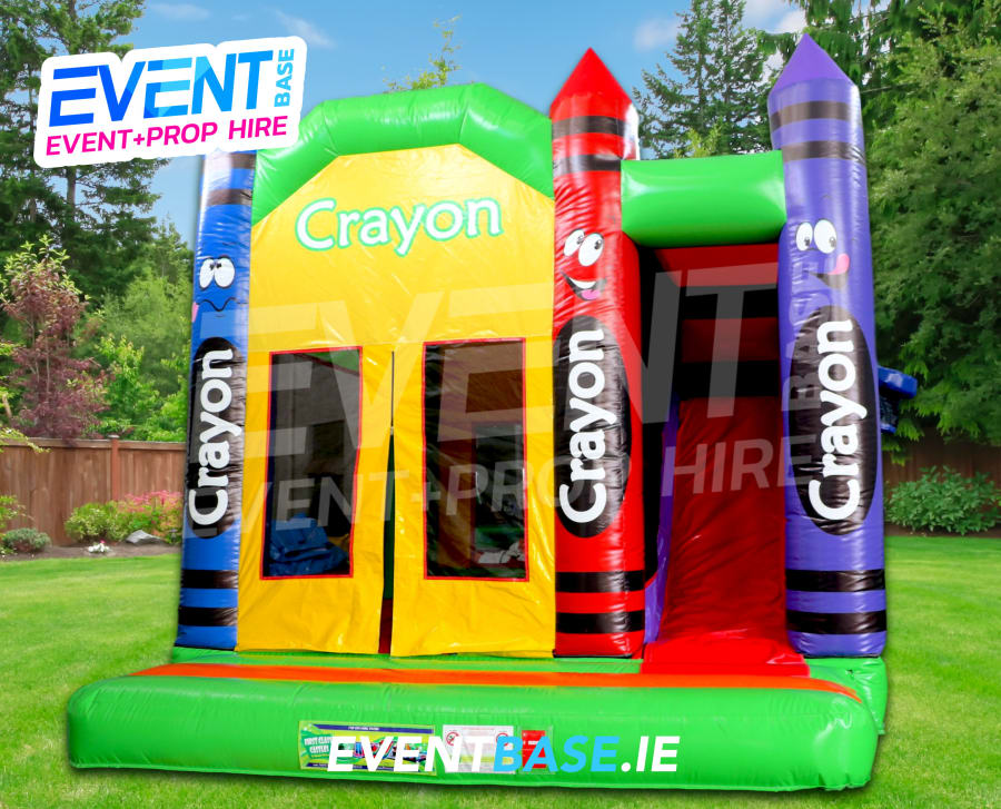 Description: 18ft(W) x 18ft(L) x 16.5ft(H) Cool Crayola Inspired Crayon themed Bouncy Castle with Slide Combo. It's a Bouncy Castle consisting of a climbing area and 2metre high internal slide. Fully enclosed bouncing area with safety netting allowing for increased visibility and ease of supervision with an open front. This unit has a generous bouncing area, as well as a climbing lane which leads to the all important slide. This inflatable is fully covered, including the slide area, which makes this inflatable a great all weather unit also. This unit has the highest safety rating and is highly recommended by our staff. The popular crayon design and complimentary colours are a hit with kids of all ages. This unit is exclusively designed & built for EventBase.