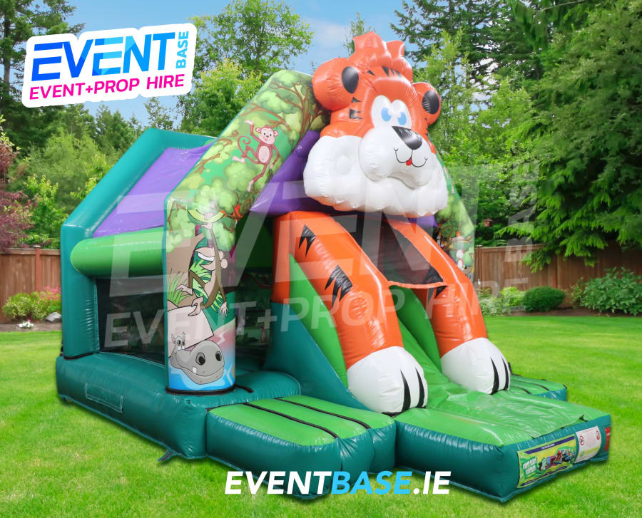 Description: 18.5ft(L) x 13.5ft(W) x 13ft(H) 3D Tiger / Big Cat themed Bouncy Castle with front-slide combo for hire. Bounce and slide out beneath the Tiger's head. Ideal for narrow gardens with limited space and indoor venues. Awesome 3D Tiger Head leaping out of the front of the unit which is visually striking and the perfect theme setter for any Zoo, Jungle or Safari themed birthday party, Christening, Communion, Confirmation or event. This unit is fully covered and is essentially an inflatable room. Looks fantastic with digitally printed Jungle artwork throughout.