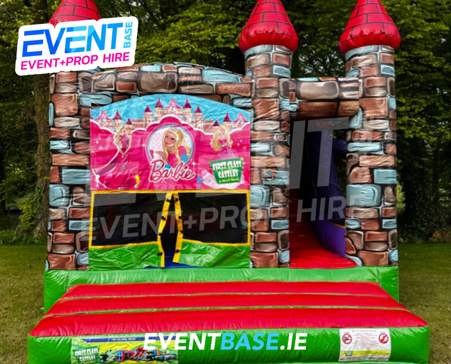 Description: 16ft(L) x 13ft(W) x 12ft(H) Bouncy Castle with slide. We've been hiring inflatables for 15 years and this model has been by far our most popular item since the very beginning, we refresh these bouncy castles annually, with a new range of themed banners in rotation. This particular product is a hugely popular Barbie theme. Visually stunning castle design, AT LAST!!! A bouncy castle that actually looks like a castle. The unit consists of a generous bouncing area with a climbing lane which leads to a 6ft high internal slide, which exits the castle. Great fun, oh to top it all off. . . . a basketball net is fitted to the side of the castle also. Easy unit to supervise with safe visibility netting all around and ideal for gardens when a slide is required but width may be an issue. This castle is designed to keep the slide and castle covered in the event of bad weather.