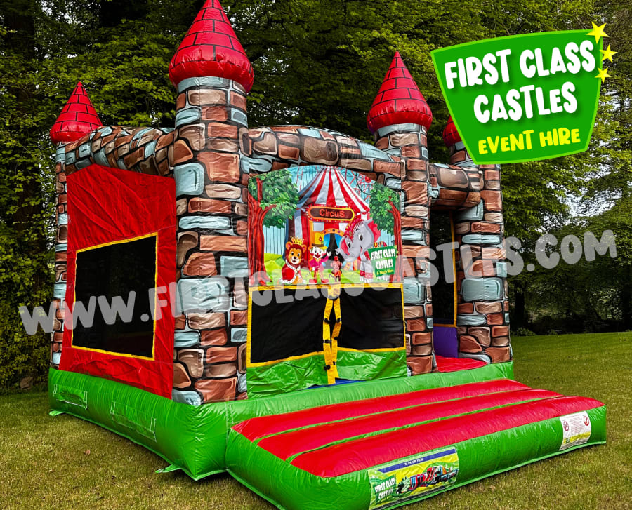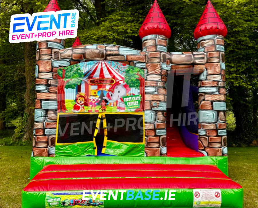 Description: 16ft(L) x 13ft(W) x 12ft(H) Bouncy Castle with slide. We've been hiring inflatables for 15 years and this model has been by far our most popular item since the very beginning, we refresh these bouncy castles annually, with a new range of themed banners in rotation. This particular product is a hugely popular Circus Carnival Fairground theme. Visually stunning castle design, AT LAST!!! A bouncy castle that actually looks like a castle. The unit consists of a generous bouncing area with a climbing lane which leads to a 6ft high internal slide, which exits the castle. Great fun, oh to top it all off. . . . a basketball net is fitted to the side of the castle also. Easy unit to supervise with safe visibility netting all around and ideal for gardens when a slide is required but width may be an issue. This castle is designed to keep the slide and castle covered in the event of bad weather.