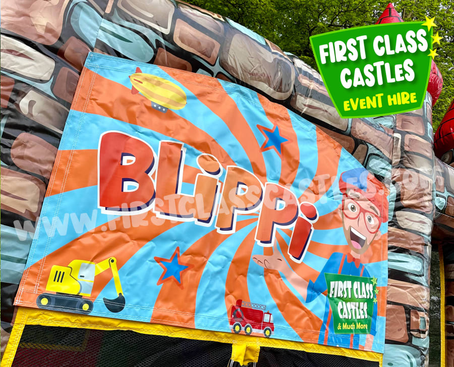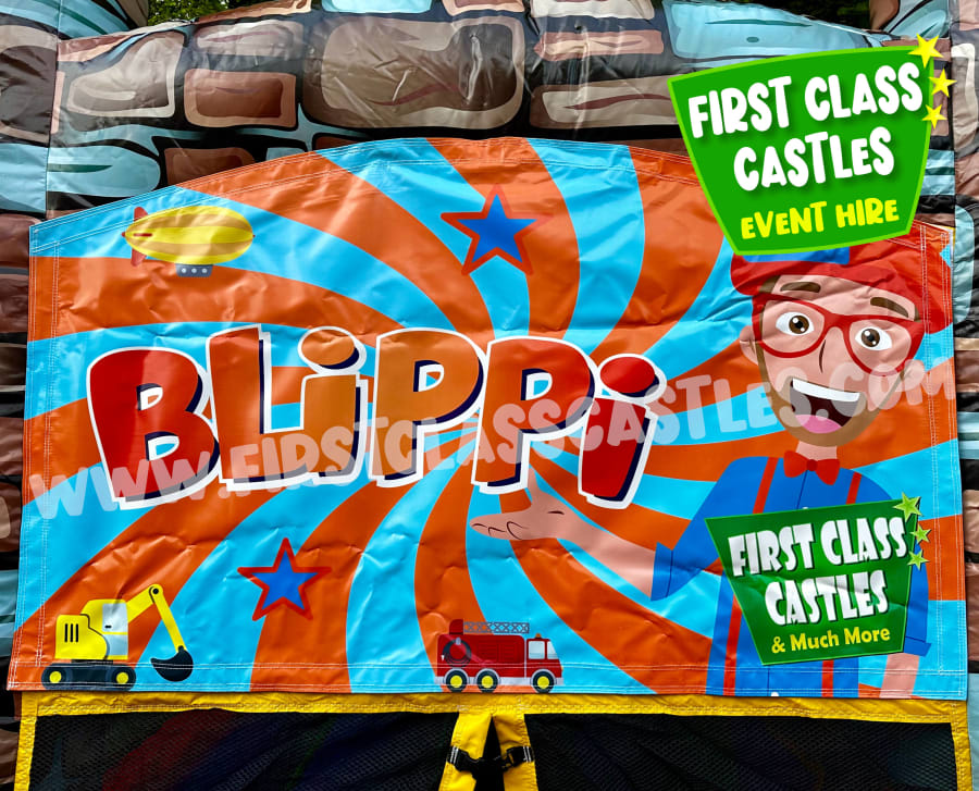 Description: 16ft(L) x 13ft(W) x 12ft(H) Bouncy Castle with slide. We've been hiring inflatables for 15 years and this model has been by far our most popular item since the very beginning, we refresh these bouncy castles annually, with a new range of themed banners in rotation. This particular product is a hugely popular Blippi theme. Visually stunning castle design, AT LAST!!! A bouncy castle that actually looks like a castle. The unit consists of a generous bouncing area with a climbing lane which leads to a 6ft high internal slide, which exits the castle. Great fun, oh to top it all off. . . . a basketball net is fitted to the side of the castle also. Easy unit to supervise with safe visibility netting all around and ideal for gardens when a slide is required but width may be an issue. This castle is designed to keep the slide and castle covered in the event of bad weather.