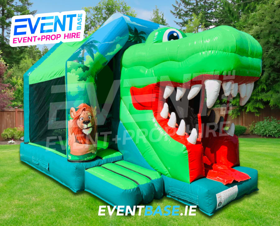 Description: 18ft(L) x 14ft(W) x 13ft(H) Alvin Alligator themed Castle with front-slide. Perfect Castle to entertain your kids for hours on end. Ideal for narrow gardens with limited space and indoor venues. Awesome 3D Snappy Alligator Mouth Slide out of the unit which is visually striking and the perfect theme setter for any party or event. This unit is fully covered and is essentially an inflatable room. Looks fantastic with digitally printed Jungle / Safari themed artwork throughout. Perfect for Many Zoo / Safari / Jungle / Wild Animal Theme Party or Event.