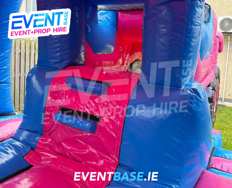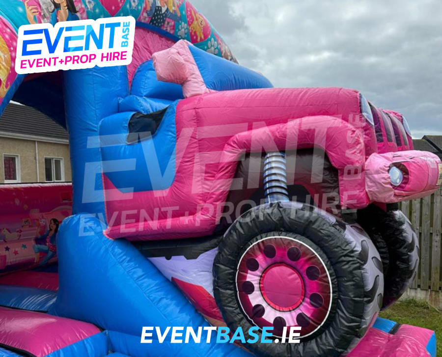 Looking for an exciting and visually striking addition to your party or event? Ride in style with Barbie and her pals in this cool bright pink 3D SUV inflatable bouncy castle with slide combo! This Barbie Malibu inspired inflatable incorporated a stunning bright pink monster truck jeep... girl bossing the whole situation on the Miami Strip! Birthday Parties & Events are becoming increasingly themed, so if you're planning a Barbie or Doll themed party, this bouncy castle hire is the perfect choice! This 3D Malibu Barbie inspired truck themed bouncy castle with a front-slide combo is sure to amaze and entertain kids of all ages. The front facing slide is disguised as a bright pink truck!