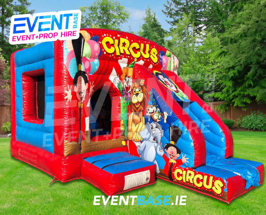 Description: 18ft(L) x 12ft(W) x 10ft(H) Circus themed Castle with front-slide. Perfect Castle to appeal to all ages with a neutral design for both boys and girls. Ideal for narrow gardens with limited space and indoor venues. This unit is fully covered and is essentially an inflatable room. Looks fantastic with digitally printed Circus artwork throughout. Unleash the tigers... let your kid be a ringmaster of their very own Circus for the day!