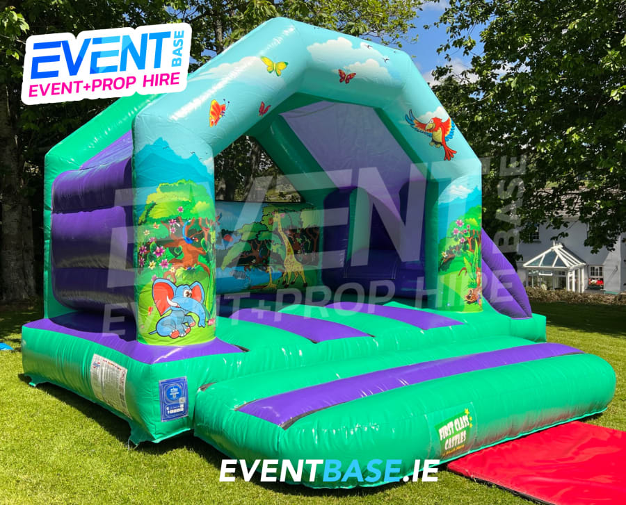 Description: Introducing our Jungle Theme Bouncy Castle with side-slide. A nice neutral Jungle / Safari theme suited to girls and boys of all ages. Let your Child's imagination run wild with this illustrated Wild Animal Theme on this Bouncy Castle! This is a stunning new unit specially designed for First Class Castles. Comes with fitted rain-cover as standard.