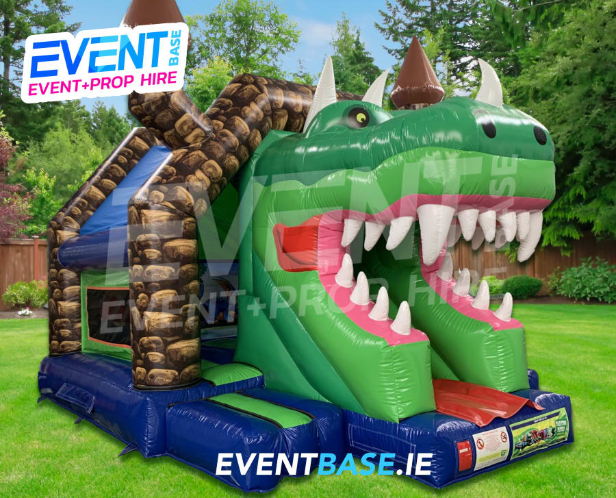 Description: Introducing our magical Dragon Age Bouncy Castle with spiralling side slide. For over 200 years the Sleepy Green Dragon has stayed in his lair to protect this inflatable Medieval Fortress from invaders, while his master the Wizard Merlin travelled on his spell bounding missions. His daughter Princess Fiona remains trapped in the tallest tower waiting for her prince to rescue her..... but he must conquer this fire breathing dragon and raging inferno first!.... Let Your Child's imagination run wild by hiring our incredible Dragon Age Bouncy Castle with 3ft Front-facing Side Slide. The Castle is fully themed with superb art-work throughout. The 3D effect Dragon is really impressive and kids become quite fond of him by the end of the day. Once again this inflatable is exclusive to EventBase.... Let the Battle Commence... Book today.