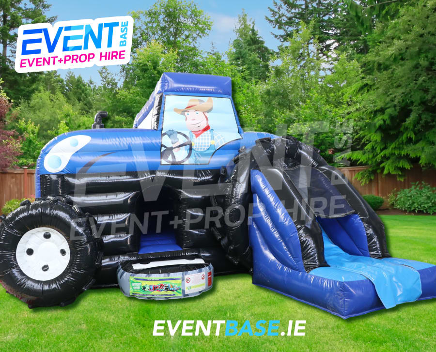 Description: Giant 3D "New Holland" inspired tractor themed bouncy castle. Imagine the look on your budding little famers face when this mega 3D tractor inflates! Complete with bouncing area and a nice 3ft slide out the front of the unit. This inflatable is also fitted with a shower cover. We highly recommend this unit which is highly rated by our little farmers. Exclusive to EventBase. Also available in a Green & Yellow John Deere Inspired Version.