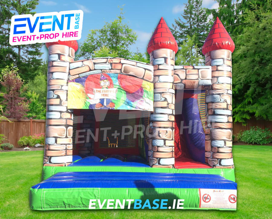 Description: Bouncy Castle with slide. Visually stunning castle design, AT LAST!!! A bouncy castle that actually looks like a castle. The unit consists of a generous bouncing area with a climbing lane which leads to an 8.5ft internal slide, which exits the castle. Great fun, oh to top it all off. . . . a basketball net is fitted to the side of the castle also. Easy unit to supervise with safe visibility netting all around and ideal for gardens when a slide is required but width may be an issue. This castle is designed to keep the slide and castle covered in the event of bad weather.
