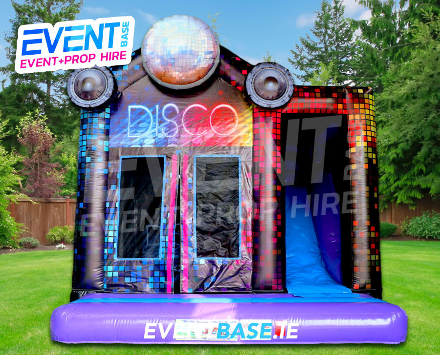 Description: 18ft(W) x 18ft(L) x 16.5ft(H) Boogie your party away in this incredibly cool disco themed castle. It's a Bouncy Castle consisting of a climbing area and 2metre high internal slide. Fully enclosed bouncing area with safety netting allowing for increased visibility and ease of supervision with an open front. This unit has a generous bouncing area, as well as a climbing lane which leads to the all important slide. This inflatable is fully covered, including the slide area, which makes this inflatable a great all weather unit also. This unit has the highest safety rating and is highly recommended by our staff. The neutral disco design and complimentary colours are a hit with kids of all ages. This unit is exclusively designed & built for EventBase. Light & Music is available as an optional extra, contact us directly to upgrade.