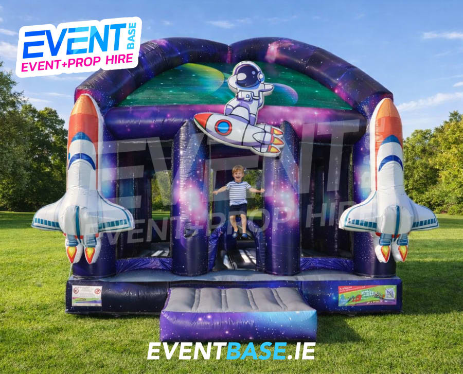 Featuring a vibrant galaxy backdrop, eye-catching rocket pillars, and a fun astronaut-on-a-rocket centrepiece, this large bouncy castle creates an instant sense of adventure. Kids will love jumping, bouncing, and pretending they’re exploring outer space, while parents will love its size, safety, and visual impact.