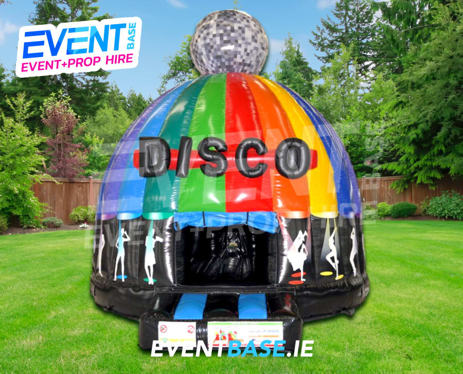 Description: Mega Multi-coloured Inflatable Dome with Bouncy Floor.... Why Hire a DJ when you can hire this? Neutral disco theme with 3D Disco sign over entrance. This dome is easy to access for all ages as there are no squeeze doors. The dome is fitted with a Bluetooth enabled music system, meaning your guests can connect their phones to send music to the Bouncy Castle! How Cool! The dome is also fitted with a flashing lighting system, which is reflected off the gloss black interior, bouncing the light all around the dark chamber. The exterior is printed in an incredible disco theme and the high multi-coloured roof is a sight which will be seen all around with a huge visual impact.