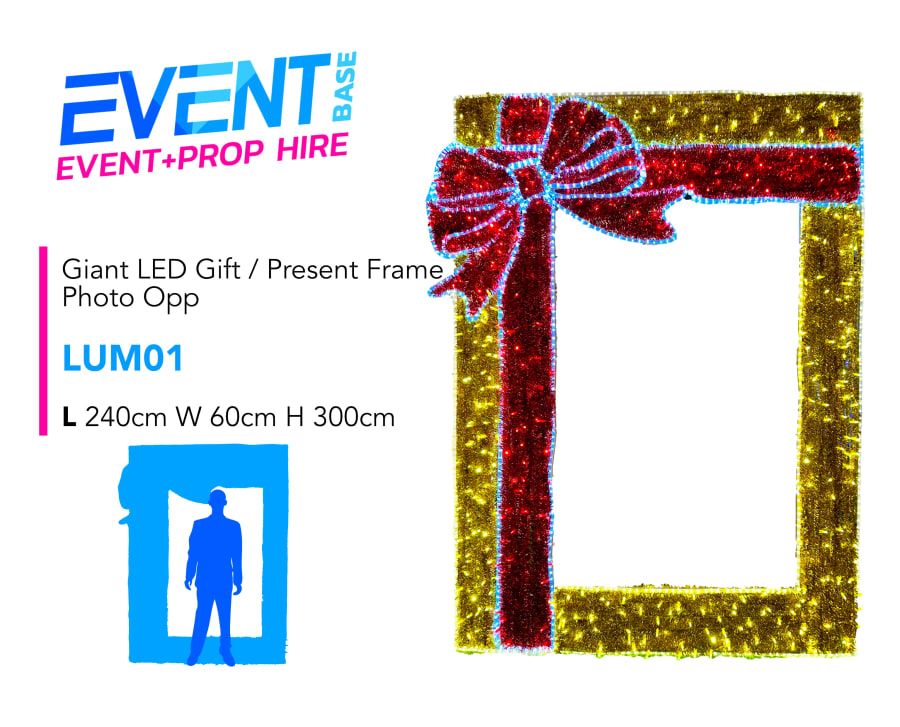 Description: Introducing exceptional LED Christmas Present Photo Frame Photo Opportunity (LED01) for Hire. This illuminating free-standing photo frame prop is the perfect photo opportunity for any Seasonal Event. Requires access to a power supply for the integrated LED lighting and can be installed indoors or outdoors. A covered space is preferred in an outdoor setting to keep guests dry. This item can also be branding to incorporate any client logo or event theming on the frame itself. Contact us directly regarding your branding requirements. 📸