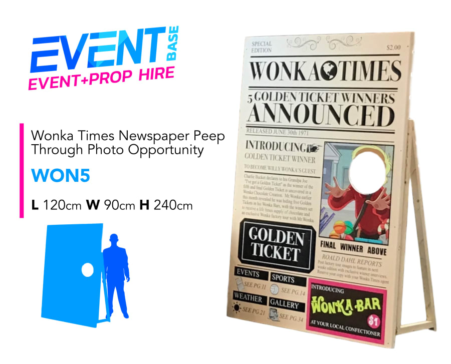 Description: Introducing our Wonka Times Photo Board prop for hire photo opportunity prop for hire. Imagine the front cover of the Wonka Times Newspaper as Willy Wonka announces his five Golden Ticket giveaway! This prop model is suitable as simply a giant decorative sweet or candy prop at your event. Check our all our other Giant Sweet, Gingerbread, Chocolate & Candy Bar themed products. This prop display model is ideal for any Celebrations, Birthday Parties, Anniversaries, Christmas, Santa's Grotto, Candy Land, Charlie & the Chocolate Factory, Willy Wonka, Carnival, Grinch or Giant Sweet theme!