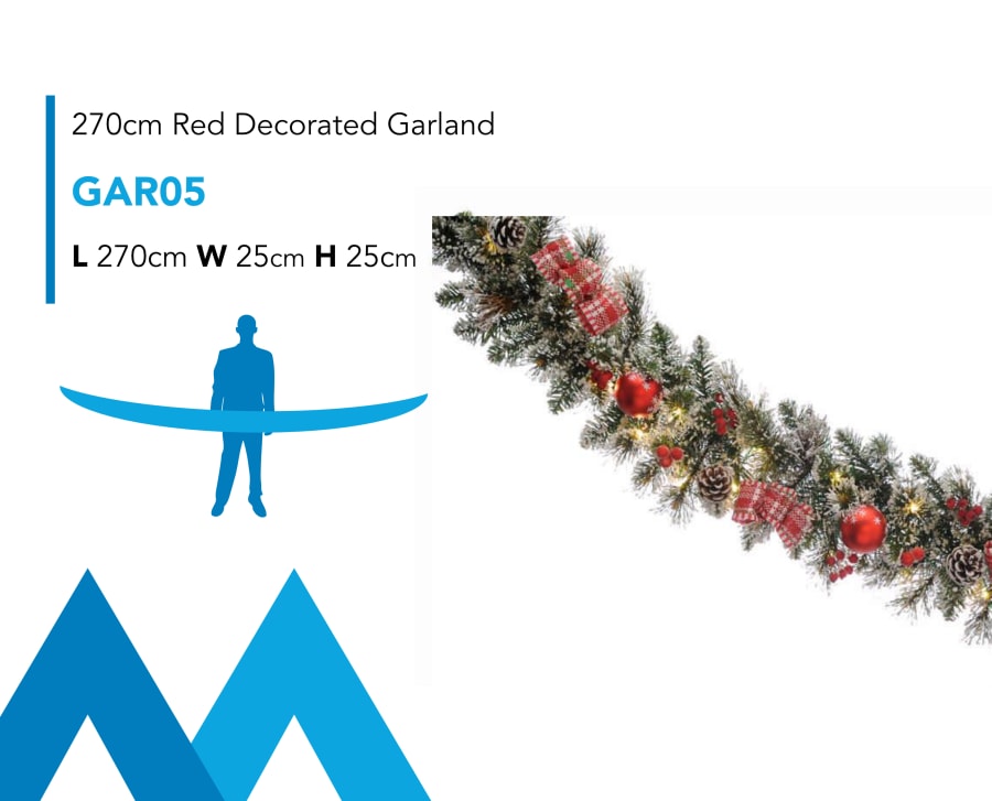 Description: Introducing our 270cm (9ft) Premium Red Decorated Christmas Garland Event Prop / Decoration for hire. Our high quality event garlands are available for rent and are our one of most popular Christmas Hire products with literally 100's in stock in different shapes and sizes. These garlands are ready to go! Our garlands & swags are quickly and easily set up at your venue. You can choose to self install or have our crew install as part of your event hire package. Don't forget suitable hangings will be required for wall mounted or aerial garland hanging. Speak to a member of our EventBase team to discuss delivery, installation and collection pricing. As with all our event hire products, these trees are available on a daily, weekly, monthly or seasonal basis, the longer you hire, the lower the average day rate!