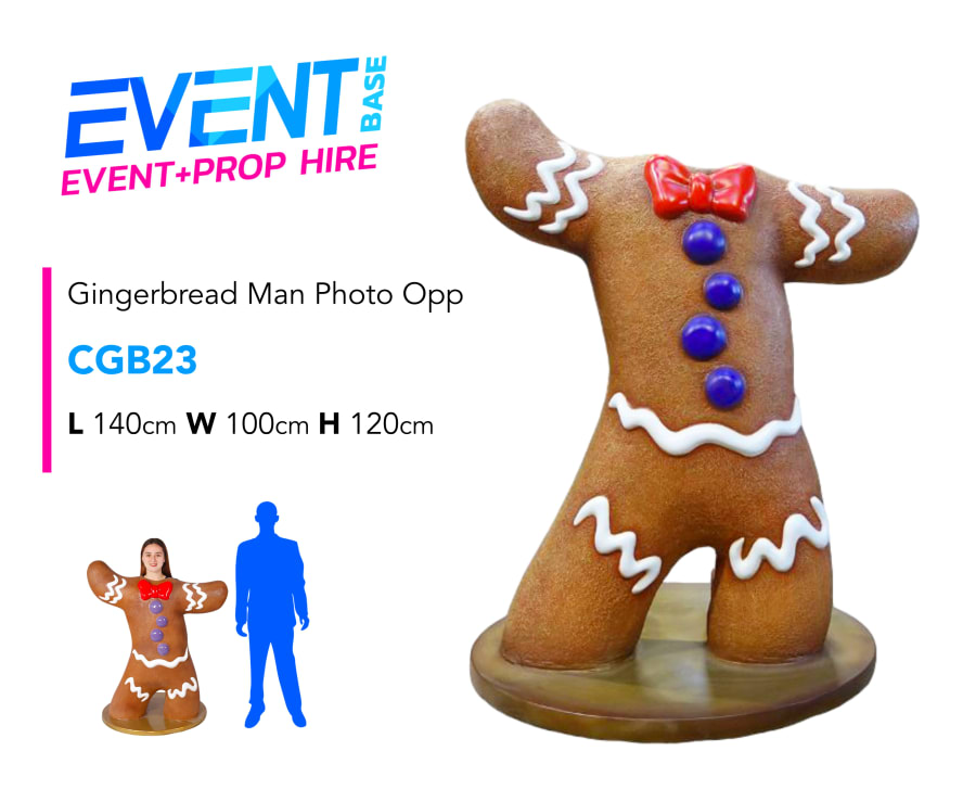 Description: Here we have our 3D Gingerbread Man Photo Opportunity. Guests simply stand in behind the model & peep over the Gingerbread Man's neck for a unique selfie or photo opp... This is a nice piece and looks great at a variety of events. This prop display model is ideal for any Christmas, Santa's Grotto, Candy Land, Charlie & the Chocolate Factory, Willy Wonka, Carnival, Shrek, Grinch or Giant Sweet theme!