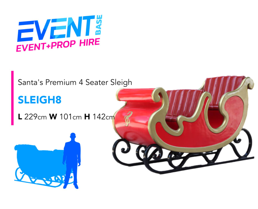 Description: Introducing our premium 4 seater red & gold Santa's Sleigh (also available as a two seater version in Red & Gold or Silver & White). EventBase offer the largest selection of Santa's Sleigh props for hire in Ireland and we stock multiples of each, in-house! No Christmas scene would be complete without one of our authentic Santa's Sleigh Prop models. Perfect for a Santa's Grotto, Photo Opportunity or even as a unique attraction at your Christmas Party. Our sleighs are capable of seating an adult and child together. Don't forget to add some Reindeer, Backdrops, Trees & Lamp-posts to create a full scene!