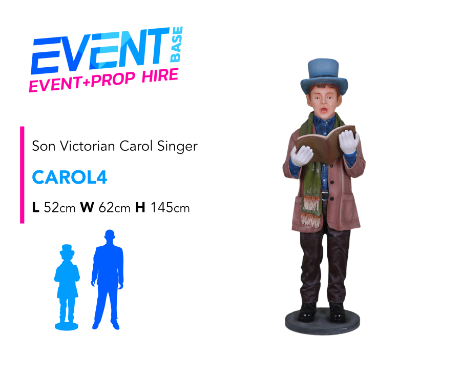 Bring the warmth and nostalgia of a traditional Victorian Christmas to your event with our beautifully detailed Victorian Carol Singing Family. This elegant resin-crafted quartet features a father, mother, and two children, each dressed in rich period attire including tailored overcoats, fur-trimmed capes, lace bonnets, and top hats. Captured mid-song with carol books and gifts in hand, this charming family looks as though they’ve stepped straight from a snow-dusted Dickensian street. This prop hire is to hire the Son character as an individual prop statue.