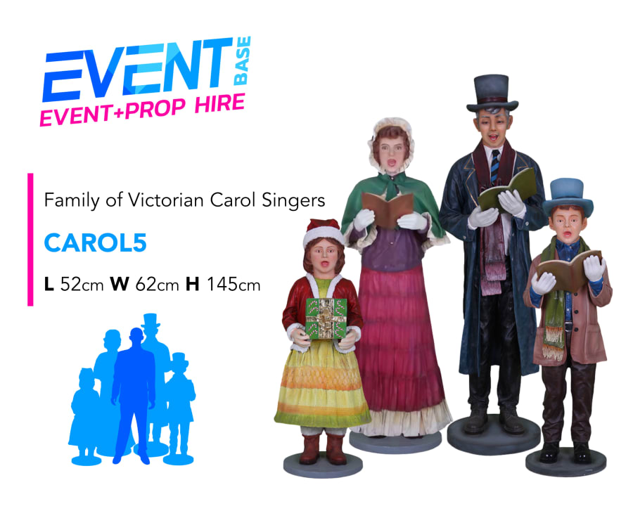Bring the warmth and nostalgia of a traditional Victorian Christmas to your event with our beautifully detailed Victorian Carol Singing Family. This elegant resin-crafted quartet features a father, mother, and two children, each dressed in rich period attire including tailored overcoats, fur-trimmed capes, lace bonnets, and top hats. Captured mid-song with carol books and gifts in hand, this charming family looks as though they’ve stepped straight from a snow-dusted Dickensian street. This prop hire is to hire the 'Full 4pc Family' character prop statue set. These are static moulded resin props, and so not actually sing or play music.