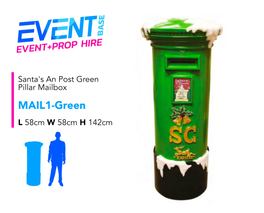 Description: No Christmas event is complete without a Mail Box! These traditional victorian pillar style mail boxes are a great size and this model has been given a splash of An Post Green to be all patriotic. Exclusively available in Ireland through EventBase. This unit is perfect for any Santa's Grotto, pop your letter in the lot and letters can be retrieved from the secret door at the back. We have a huge range of Christmas event props available for hire. Including life-size reindeers, snowmen, santa's throne, sleighs & lots more... Contact us for further information. Long and short-term hire available.