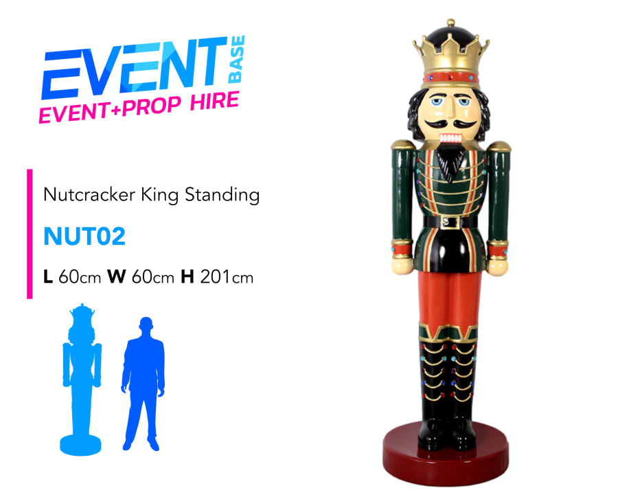 This Nutcracker King Figure is very elegant standing over 6.5ft high with a dark green coat, red trousers, boots, gold crown and embellished uniform. At EventBase we pride ourselves in having the largest selection of Life-size Nutcracker, Toy Soldier, Guards & Tin Soldier Models. Viewing available by appointment at our warehouse to choose your event selection first-hand. All our props are visually stunning and look fantastic in any event venue. We have a huge range of Christmas event props available for hire. Including life-size reindeers, snowmen, santa's throne, sleighs & lots more... Contact us for further information. Long and short-term hire available. Price is per model, for pairs add two quantity... these guys always look best in pairs at either side of an entrance for example.
