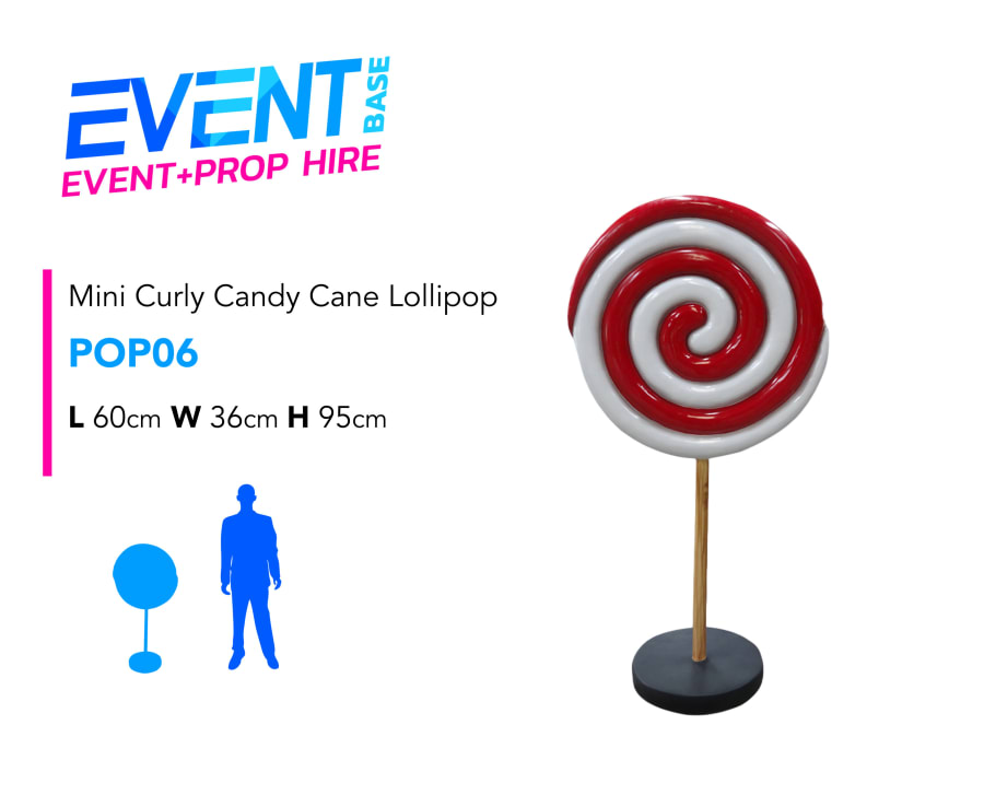 Description: Introducing our Mini Curly Pop. This is a hugely popular lollipop / candy prop hire item. Standing almost 5ft high, this lollipop on stand with base is a really striking item. This prop display model is ideal for any Christmas, Santa's Grotto, Candy Land, Charlie & the Chocolate Factory, Willy Wonka, Carnival, Grinch or Giant Sweet theme!