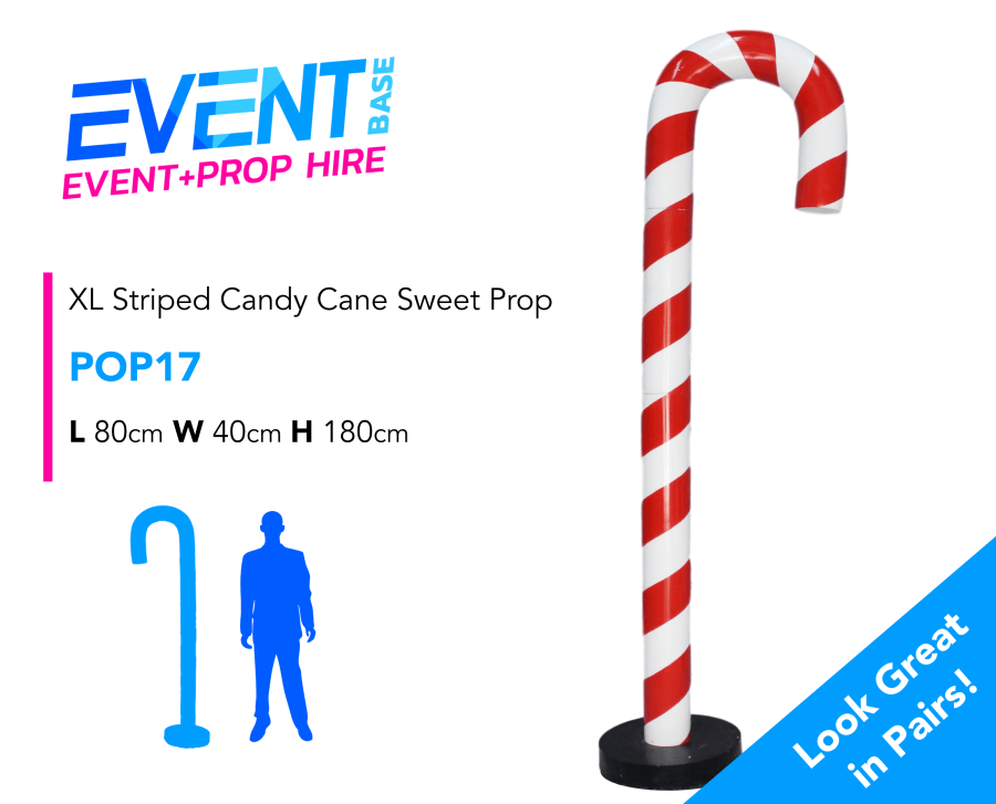 Description: Introducing our oversized XL Candy Cane striped in Red & White. This is possibly our most popular hire item and we have a large stock in our inventory. This prop display model is ideal for any Christmas, Santa's Grotto, Candy Land, Charlie & the Chocolate Factory, Willy Wonka, Carnival, Grinch or Giant Sweet theme!