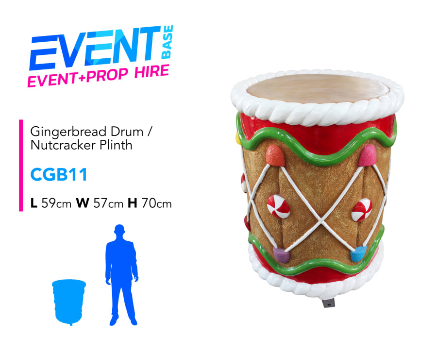 Description: Commonly used as a Nutcracker / Toy Soldier base, this gingerbread drum may be used as a display plinth, stool, side table or even as a standalone prop! This Gingerbread Drum prop for hire is a nice piece and looks great at a variety of events. Check out the other members of this Gingerbread Family including; cats, dogs, drums, sleighs and even thrones! This prop display model is ideal for any Christmas, Santa's Grotto, Candy Land, Charlie & the Chocolate Factory, Willy Wonka, Carnival, Grinch or Giant Sweet theme!
