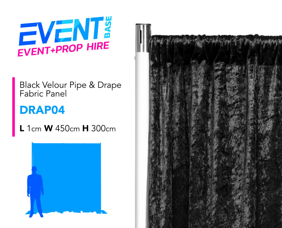 The backdrop itself is installed on a telescopic Pipe & Drape framework (hired separately). Each drape panel is fitted with a tab top pole pocket allowing the crossbar to slide through the drape panel. The cross bars then slot into the upright poles which are affixed to the heavy base plates.