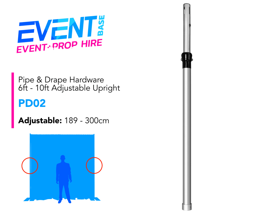 Our dry hire Pipe & Drape solution is the most cost-effective way of creating a drape installation at your event venue. Two piece height adjustable upright that uses a ball bearing locking system giving an extremely smooth lift with precision locking. The two piece system means that you have maximum stability at any height. The 6-10ft Upright means that you have a low working height before raising to the required drape height. The upright is marked with height measurement so you can keep a nice level pipe and drape line.